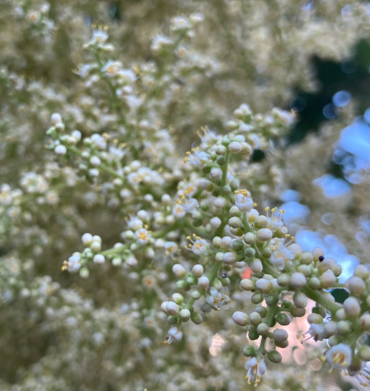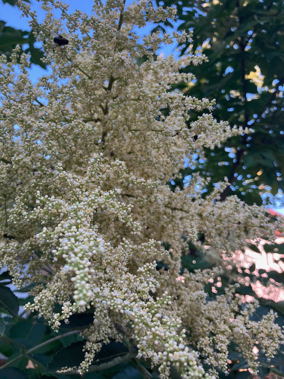 白膠木の花が今年は満開。実は食べるとしょっぱいのだと、2025個展会場に来てくださった方から教わった。楽しみにしていたが、実は一つもならなかった。こんなに花は満開で、スズメバチやその他の虫がブンブンたかって怖いくらいだったというのに。